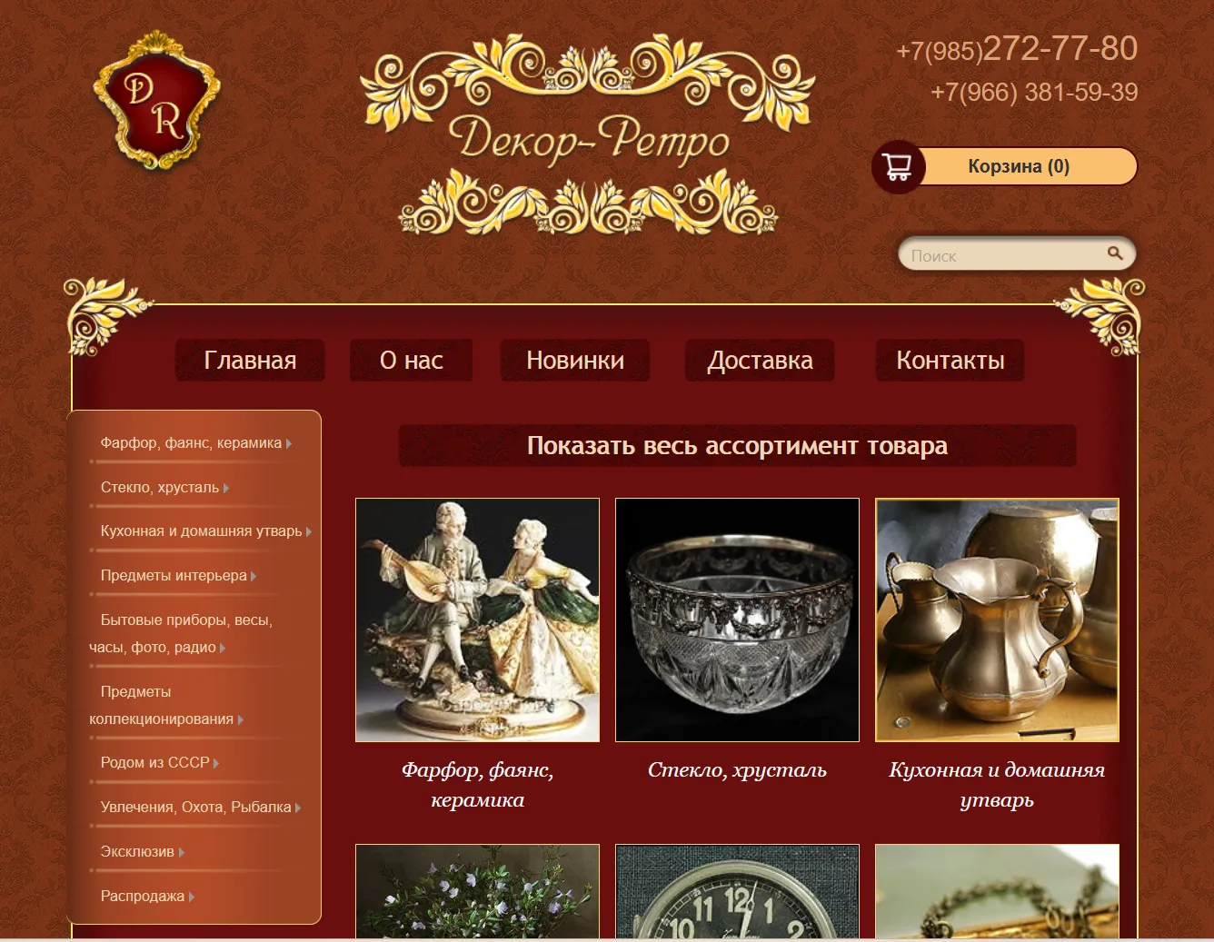 Наш интернет-каталог мы решили назвать "Декор-Ретро". Мы – это объединение друзей- единомышленников, коллекционеров уже ни в одном поколении, объединившихся в данном проекте. Целью создания "Декор-Ретро" отнюдь не является получение коммерческой выгоды от продажи предметов старины, как может показаться на первый взгляд. "Декор-Ретро"- это не очередной интернет-магазин. Основные цели и задачи данного интернет- ресурса: - это популяризация коллекционирования, развитие вкуса и понимания красоты великолепия ушедших эпох, по средством предметов бытования наших предков. Это расширение связей и взаимодействий между людьми увлечённых коллекционированием, дизайнерами декорирующими помещения с помощью винтажных предметов старины и просто людьми которым нравиться ретро стиль. В наши планы входит оказание предметной помощи, как в развитии и приумножении существующих коллекций, так и только начинающим, делающим первые, ещё робкие шаги новичкам.
