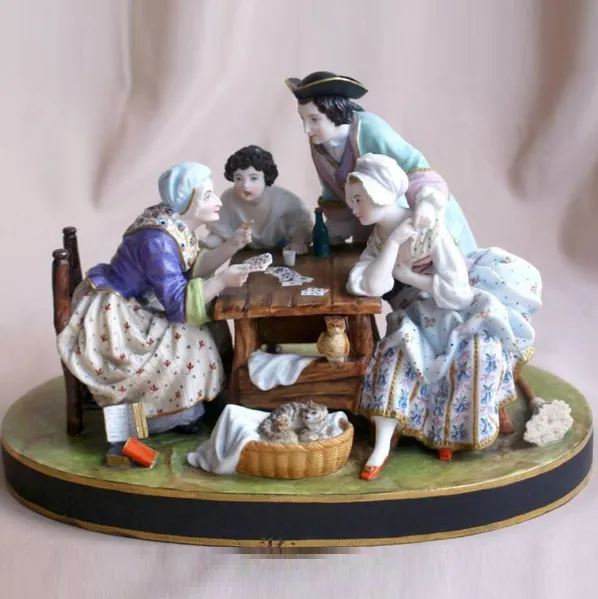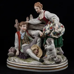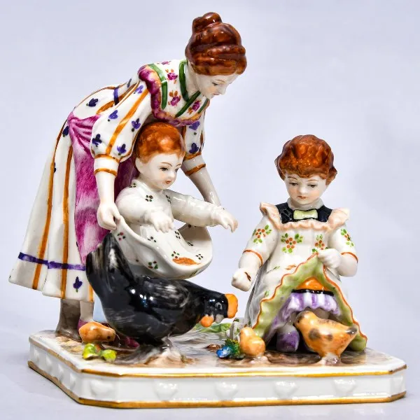 Антикварная Фарфоровая статуэтка "Едоки каши. Завтрак", а ещё её очень часто называют " КАША", Германия, мануфактура Aсkermann & Fritze (Акерман и Фриц), начало ХХ века. Фарфор, ручная полихромная роспись, позолота. Размеры: Максимальная высота - 19 см., габариты основания - 24 см. х 20 см.