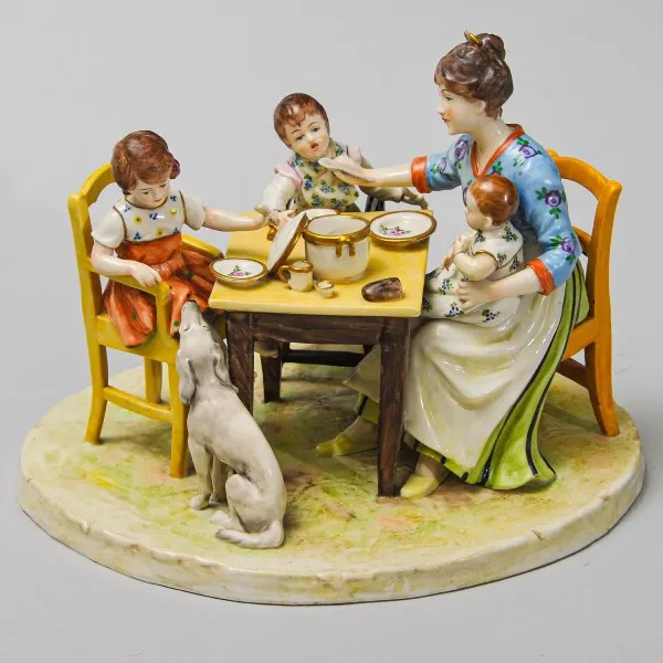Ручная авторская работа, ограниченный тираж. Фарфоровая композиция " КАША" - изображает маму, трех маленьких детей и собачку, семья сидит за столом и мама кормит детей кашей, а девочка пытается накормить и домашнего любимца. Оригинальная сюжетная линия завораживает и умиляет, статуэтка выполнена с необыкновенным мастерством и вниманием к деталям, которыми она изобилует. Прекрасное коллекционное состояние для предмета столь почтенного возраста, без сколов и трещин. Эта фарфоровая фигурка станет великолепным украшением интерьера, великолепным подарком или достойным экземпляром в коллекцию!!