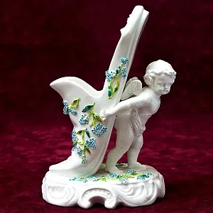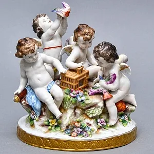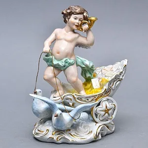 Фарфоровая фигурка маленького путти - ангелочка сидящего на шаре с гроздью винограда в руке и в венце из виноградных листьев выполненная в классическом дворцовом стиле смотрится стильно и антуражно, станет прекрасным украшением интерьера или достойным экземпляром в коллекцию. Благодаря бережному витринному хранению статуэтка в прекрасном коллекционном состоянии, без сколов, трещин и реставрации!! Прекрасное украшение в Вашем доме, или Достойный экспонат в любой коллекции!!! или же, Хороший подарок для знакомых и близких, в особенности если они является ценителями фарфоровой скульптуры!!!