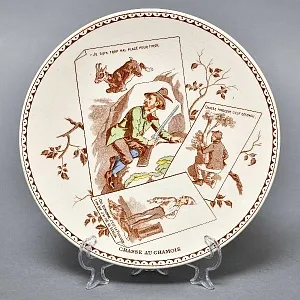 Антикварная Декоративная Коллекционная тарелка "Охота на дикого кабана" - "Chasse au Chamois" из серии "ОХОТНИКИ", Франция, фабрика Sarreguemines / Саргемин, конец XIX века. Фаянс, печать. Диаметр тарелки - 21,5 см.