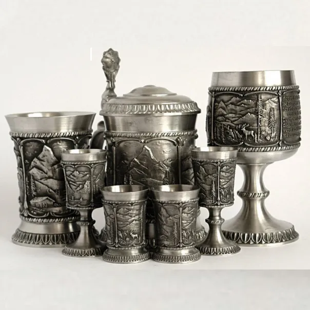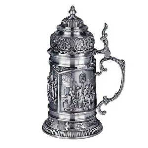 Посуда из олова с давних времен считается наилучшим металлом для создания кухонной утвари,так как является одним из самых чистых металлов. При соприкосновении с горячей пищей и перегреве посуда из олова не портится. Вредные вещества не выделяются – хотя бы потому, что их в составе доброкачественных изделий просто нет. В оловянной посуде пища никогда не приобретет постороннего вкуса или запаха. Окисления тоже не произойдет, как со стороны пищи, так и со стороны посуды. Олово не вступает ни в какие реакции с продуктами питания. Ее использование абсолютно безопасно. Этот металл также имеет прекрасное свойство, которое позволяет ему не ржаветь, что отличает его от других. Выглядят предметы из этого металла изысканно, стильно и величественно - это связано с тем, что олово на удивление пластичный металл и позволяет выполнять самые сложные декоративные композиции. Под воздействием воздуха олово способно выцветать, что придает ему приятный бархатисто-серый оттенок, который называется «патина». Старинная посуда с наличием такого оттенка имеет особо высокую ценность среди коллекционеров. Если Вы хотите придать изделию из олова блеск и очистить от грязи и патины, его нужно вымыть в горячей воде с применением посудомоечной жидкости. После мытья предмет нужно насухо протереть мягкой тряпкой и можно натереть полиролью для латуни или серебра и Ваше изделие будет иметь восхитительный вид.