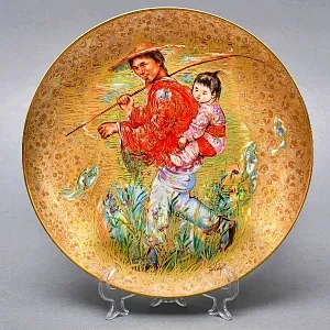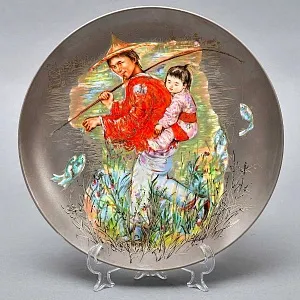 Роскошная и изысканная тарелка "Mr.Obata" декорирована в ориентальном стиле, украшена живописным изображением японского рыбака в красном халате, несущего на спине ребёнка. В его руках — удочка, а вокруг — золотистые воды реки, переливающиеся под лучами солнца, и плавающие рыбы, словно символизирующие плодородие и благополучие. На заднем плане — далёкие силуэты деревень и лодок, окутанные дымкой утреннего тумана.