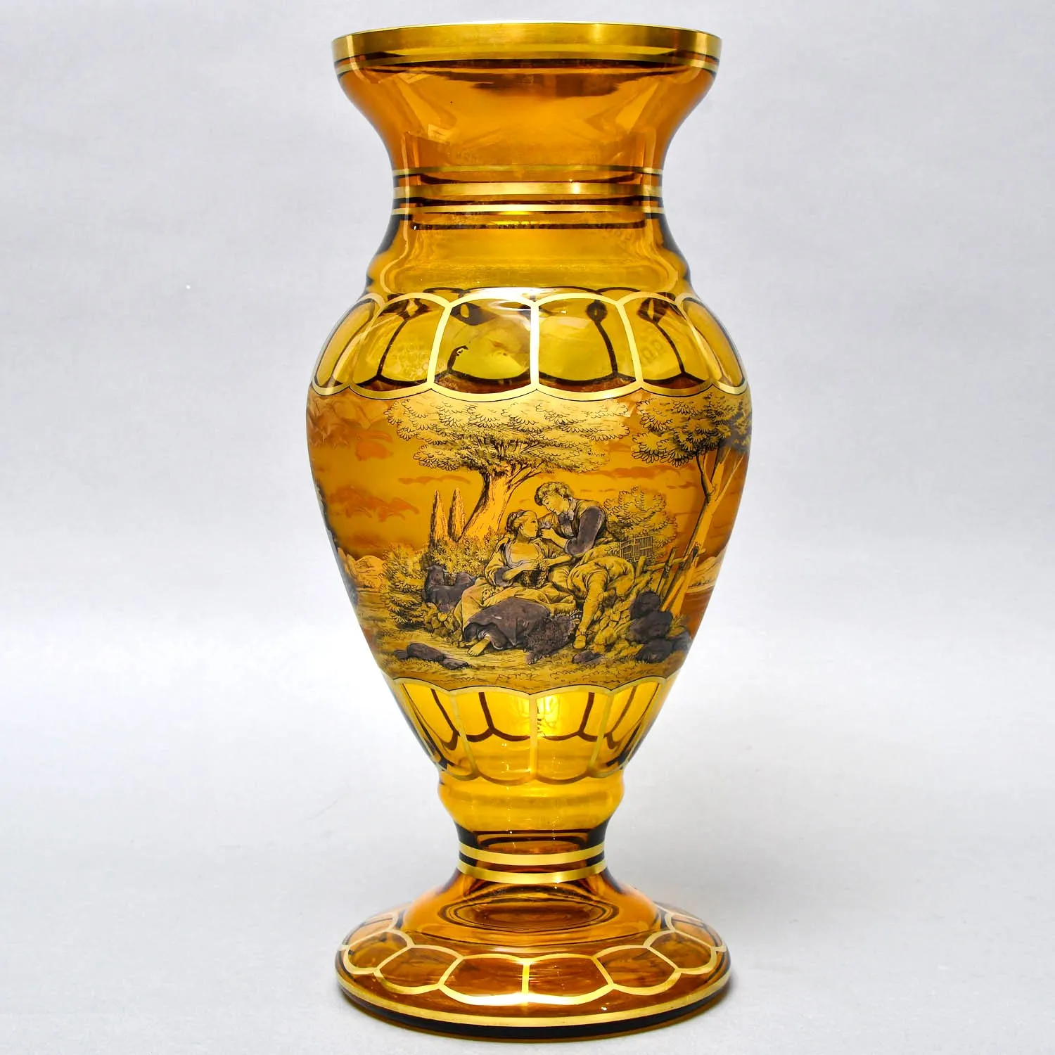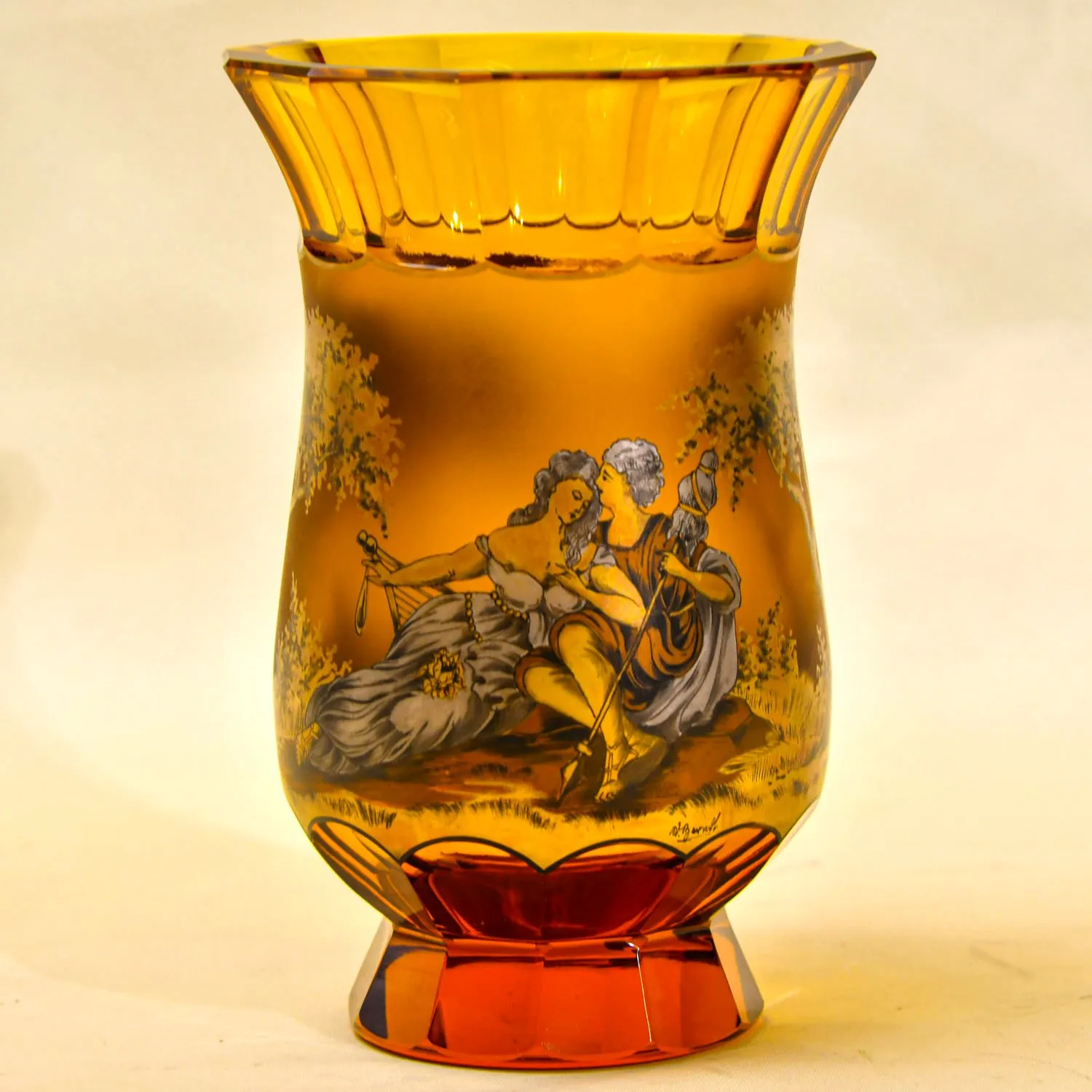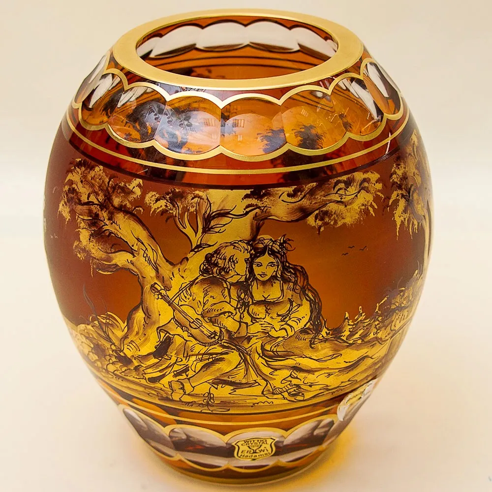Ваза цветного хрусталя карамельного цвета, имеет оригинальный и необычный авторский декор - на глазурь цвета жженой карамели золотом и черным пером, нанесена картина с изображением свидания кавалера и его прекрасной дамы на фоне колоритной природы. Влюблённые, средневековая пара, мужчина и женщина, очень милый и романтичный сюжет. На изображении есть подпись автора.
