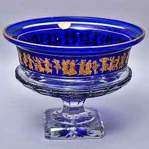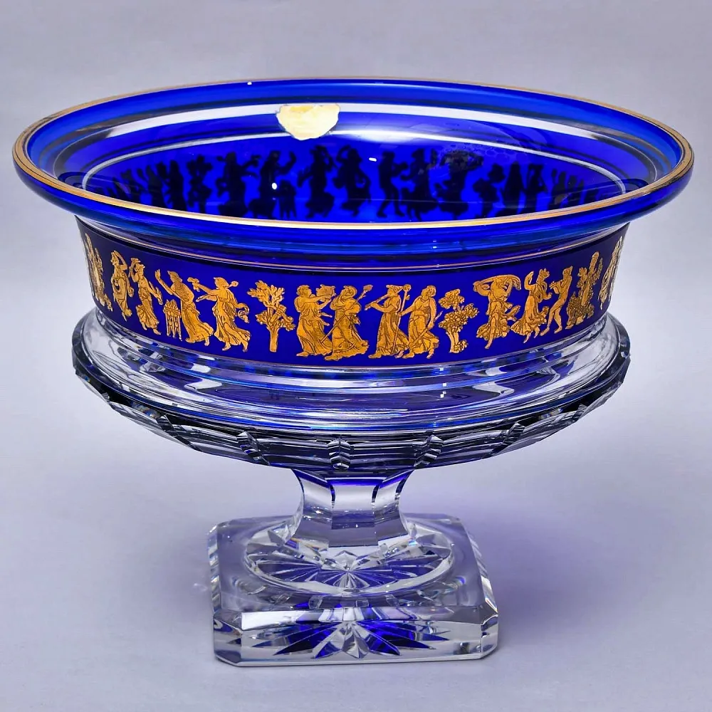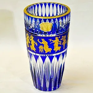 Большая Роскошная Хрустальная Ваза для цветов амфорной формы "Танец" - "Jupiter. Dance De Flore". Накладной хрусталь глубокого синего цвета, знаменитая мануфактура VAL SAINT LAMBERT (Вал Сан Ламберт), Бельгия середина ХХ века. 100% ручная работа, высочайшая геометрия шлифа с максимальной глубиной резки, роспись золотом, сигнирование. Всё сделано в лучших традиция высочайшего качества хрустальной марки VAL SAINT LAMBERT.