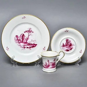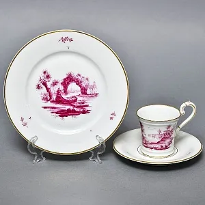 Декор кофейной тройки - это очаровательные пейзажи, нанесенные вручную пурпурной эмалью; края подчеркнуты тонкой золотой каймой, что придает набору роскошный и благородный вид. Все предметы в прекрасном состоянии, без сколов и трещин. Помимо своей коллекционной составляющей, полностью пригодны для использования по прямому назначению - для питья кофе, ароматный напиток из такой посуды станет намного вкуснее. Позвольте себе насладиться атмосферой прошлого, держа в руках настоящий шедевр немецкого фарфорового искусства. Эта кофейная пара с десертной тарелкой — не просто посуда, а произведение искусства, которое будет радовать долгие годы!