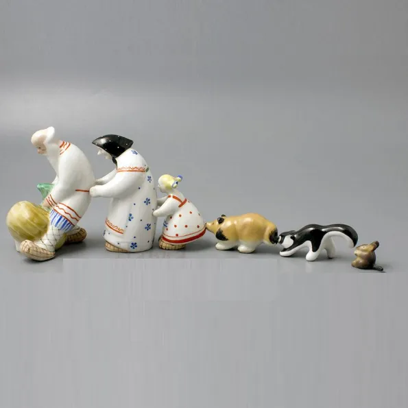 Шикарная, сказочно милая статуэтка. Казалось бы, совершенно простенький сюжет, но как талантливо воплощён, не оторвать глаз. Бабушка с добрым выражением лица, которая держит в руках крынку молока, а у её ног трётся кошка. Всё сделано лучших традициях Советской школы фарфора, с любовью к мельчайшим деталям. Статуэтка смотрится потрясающе, и безусловно представляет коллекционный интерес! В результате витринного хранения, не смотря на столь почтенный возраст, состояние предмета очень хорошее, без сколов и трещин. На выбор: Хороший подарок или Достойный экспонат в любую коллекцию!