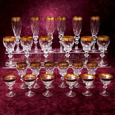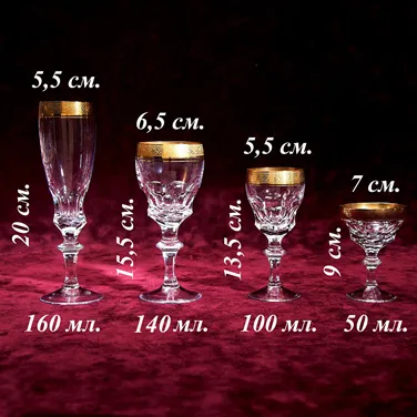 Роскошный, стильный, редкий, набор из 6-и бокалов для вина, Германия, мануфактура Theresienthal / Терезиентал, серия Конкорд / Concorde, вторая половина ХХ века. 100% ручная работа, высококачественный прозрачный тонкостенный хрусталь с мелодичным звоном, золотой чеканный борт 1,5 см, позолота (натуральное 24-х каратное золото). На данный момент времени в наличии имеются четыре комплекта по шесть предметов: фужеры для шампанского, бокалы для вина, рюмки для водки, рюмки для ликёра или наливки. Размеры: бокалов - Высота - 15,5 см., диаметр - 6,5 см., объём - 140 мл.