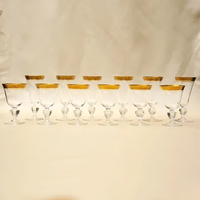 Роскошный, стильный, редкий антикварный набор из 6-и бокалов для вина, Германия, мануфактура Theresienthal / Терезиентал, серия Марлоу / Marlowe, первая половина ХХ века (изделия декора Marlowe перестали выпускать с конца 60 х годов). 100% ручная работа, высококачественный прозрачный тонкостенный хрусталь с мелодичным звоном, золотой чеканный борт 1,5 см, позолота (натуральное 24-х каратное золото). На данный момент времени в наличии имеются два комплекта по шесть бокалов для вина и два комплекта для шампанского.