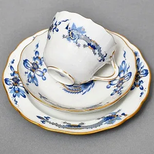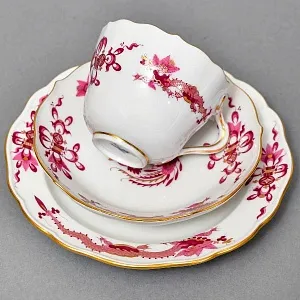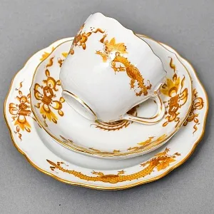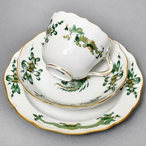 Классическая Кофейная пара (чашка с блюдцем) и Десертная тарелка "Зеленый Дракон" от самой знаменитой фарфоровой мануфактуры Германии MEISSEN / МЕЙСЕН. Первая половина ХХ века. Клеймо в виде 2-х скрещенных мечей синего цвета подглазурно. Белоснежный фарфор, ручная полихромная роспись, позолота.