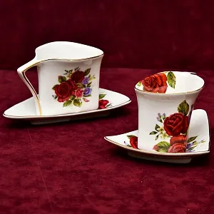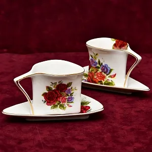 Очень красивая и яркая Чайно - Кофейная пара оригинальной треугольной формы "РОЗЫ", Франция, Лиможский фарфор, вторая половина ХХ века. Фарфор, роспись, позолота.