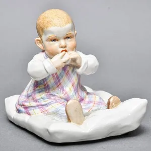 Представляем вашему вниманию одну из очаровательных статуэток из легендарной серии «Дети Хеншеля» / Hentschel Children - «Ребёнок с палкой и барабаном». Эта фигурка — не просто украшение интерьера, а настоящее произведение искусства, воплощающее нежность, невинность и беззаботную радость детства, созданное в эпоху расцвета европейского модерна. Фигурка изображает милого мальчика с озорной улыбкой, одетого в простое белое платье, синие чулки и деревянные башмачки — типичный наряд немецкого ребенка начала XX века. Малыш сидит верхом на зеленой деревянной палочке, которую он держит обеими руками, словно это его верный конь. Маленький барабан служит опорой для этой игривой позы. Барабан раскрашен в теплые оранжевые тона с красными и белыми узорами, что создает контраст с белым платьем и добавляет композиции игривости. Каждая деталь — от прически до складок одежды — проработана с невероятной точностью, демонстрируя мастерство лучших фарфоровых художников Мейсен. Лицо ребенка — настоящий шедевр росписи. Голубые глаза, сияющие от внутреннего света, румяные щечки и едва заметная улыбка передают ощущение счастья и любопытства. Волосы выписаны тончайшими коричневыми линиями, создавая эффект натурального пробора и объема. Такая работа требует не только технического мастерства, но и душевного участия — каждый взгляд этой фигурки будто обращается к вам напрямую.