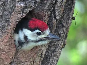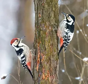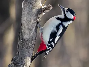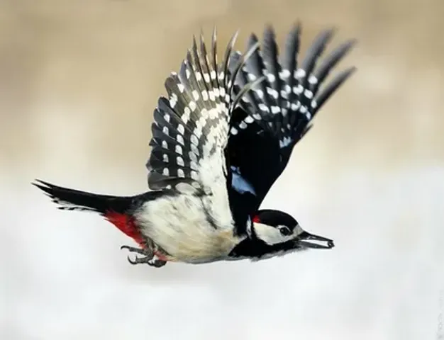 Статуэтка изображает пёстрого дятла практически в натуральную величину, сидящего на изогнутой ветке. Птица запечатлена в характерной для неё позе — вертикально, с поднятым клювом, словно прислушивается к звукам леса. Мастерски переданы все детали оперения: ярко-красный затылок и макушка контрастируют с белым лицом и оранжево-коричневыми щеками. Белая грудь плавно переходит в чёрное оперение спины с белыми точками, имитирующими перья. Хвост окрашен в тёплые коричнево-оранжевые тона, а нижняя часть живота имеет насыщенный красновато-оранжевый оттенок. Лапы с острыми когтями надёжно обхватывают ветку, а длинный серый клюв выглядит очень реалистично.