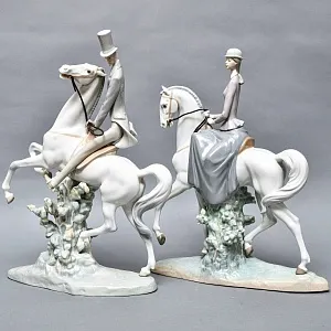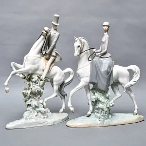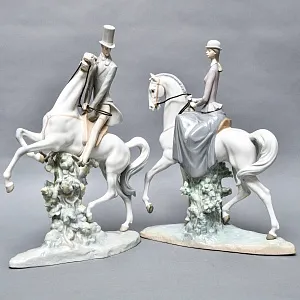 Фигура «Наездник» от Lladro представляет собой фигуру мужчины в элегантном костюме и высоком цилиндре, уверенно сидящего на белой лошади, которая встала на дыбы. Лошадь полна энергии и силы, а наездник, сохраняя невозмутимое спокойствие, держит поводья, демонстрируя мастерство и гармонию с животным. Их поза передает не только динамику движения, но и глубокую связь между человеком и конем — символом свободы и благородства. Подножие статуэтки выполнено в виде причудливого скалистого уступа с нежными цветочными мотивами, что придает всей композиции ощущение легкости и воздушности, словно она парит над землей. Композиция "Мужчина на коне" - это яркий пример галантного стиля, который сочетает в себе элегантность, изысканность и легкую игривость. Образ всадника в цилиндре и сюртуке - отсылка к моде эпохи Регентства и Викторианской Англии, когда верховая езда была не только видом спорта, но и знаком высокого общественного положения. Лошадь, вставшая на дыбы, добавляет композиции драматизма и романтизма, создавая ощущение момента, полного страсти и свободы.