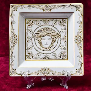 Оригинальная Коллекционная Мелочёвница - Тарелочка - Визитница - Пепельница от VERSACE (ВЕРСАЧЕ) из коллекции МЕДУЗА "MEDUSA GALA" Германия, Фабрика Розенталь - Rosenthal, это один из первых декором, которые знаменитый модельер создал для Rosenthal Versace. Фарфор, ручная полихромная роспись, позолота, эксклюзивный дизайн, ограниченный тираж. Размеры тарелочки - 22 см. х 22 см.