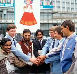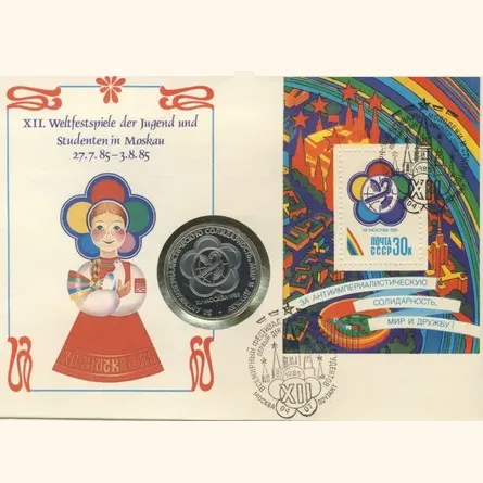 Агитационная Коллекционная Подарочная Фарфоровая Ваза для цветов, родом из СССР - Памятный подарок - Сувенир посвященный XII му Всемирному Фестивалю Молодежи и Студентов в Москве в 1985 году. 100% оригинал. Производство Барановского фарфорового завода (Барановка). Фарфор, деколь, позолота, клеймо надглазурно зеленого цвета на дне вазы.