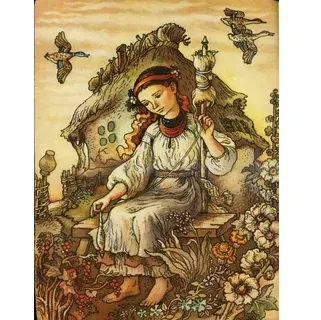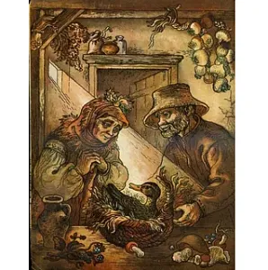 "Казка про кривеньку качечку" - "Сказка про хромую уточку" родом из СССР, Львовская керамико-скульптурная фабрика, 50-е годы ХХ века. Обливная керамика, роспись эмалями, ручная работа. Автор С.П.Караффа - Корбут.