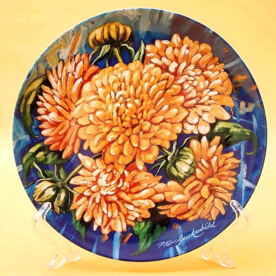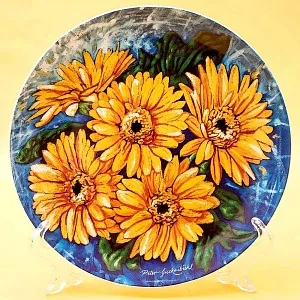 Тарелка «Герберы» , имеет персональный номер 111А и занесена в международный каталог BRADEX (В этот каталог попадают только ценные экземпляры тарелок, которые являются высокохудожественными и редкими по изготовлению). Безусловно, представляет коллекционный интерес, настоящая находка для коллекционера или ценителя фарфора! Смотрится тарелочка очень эффектно и антуражно. Необыкновенно хорошо вписывается в интерьер, всегда привлекает взгляды окружающих. В результате витринного хранения состояние тарелки идеально, без трещин и потертостей, дефектов и реставрации. На выбор: Хороший подарок или Достойный экспонат в коллекцию!
