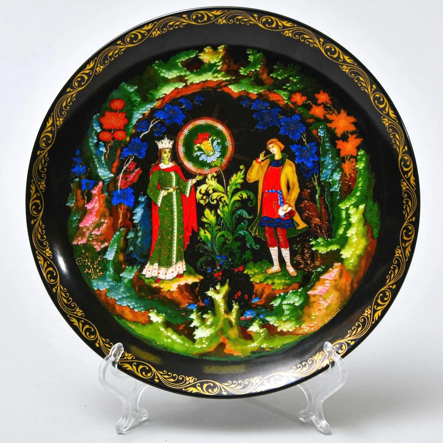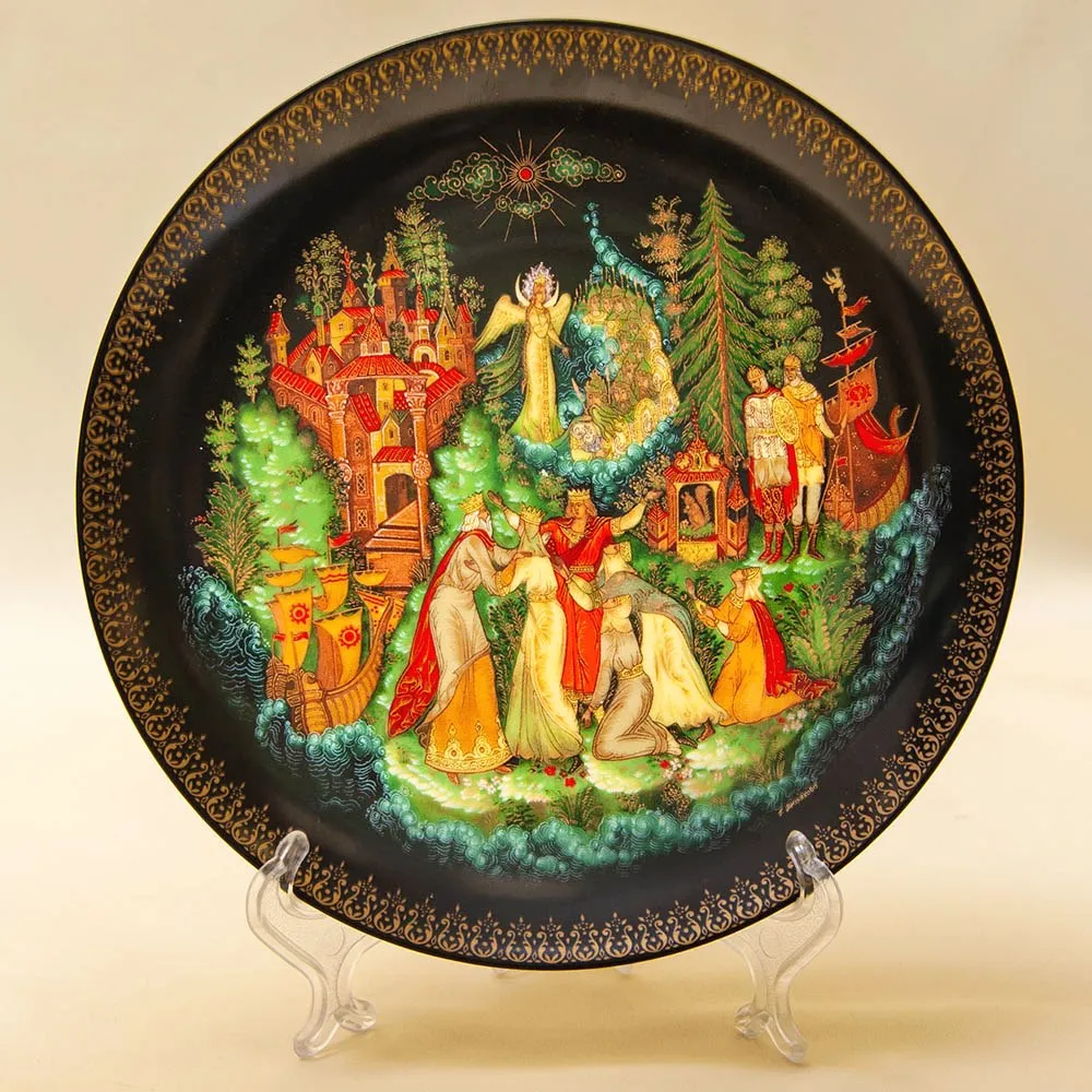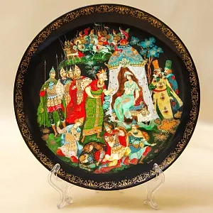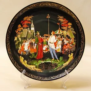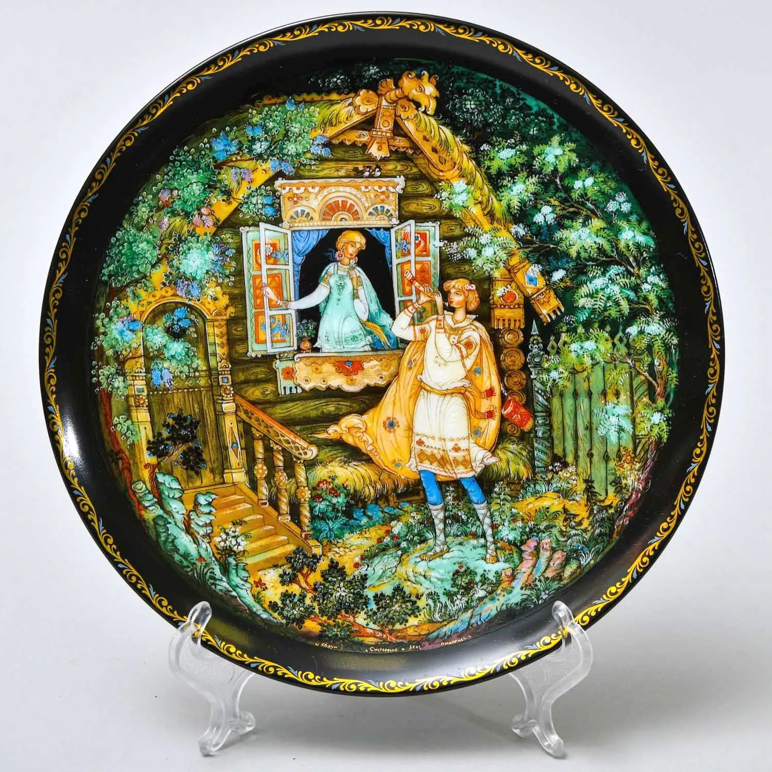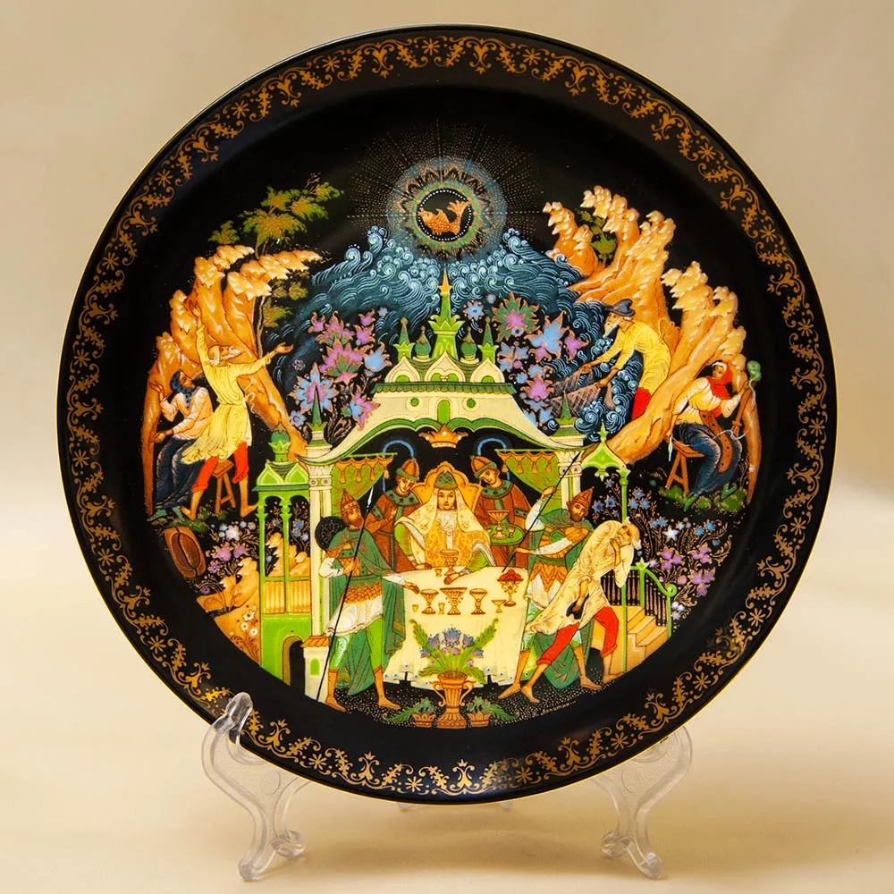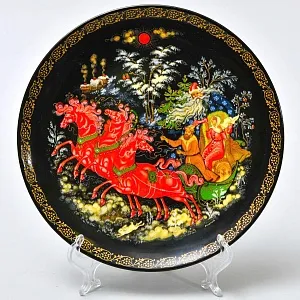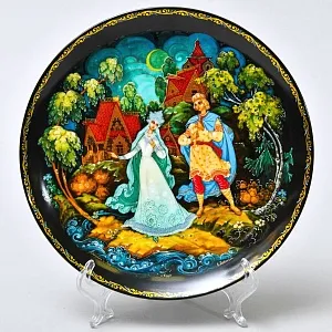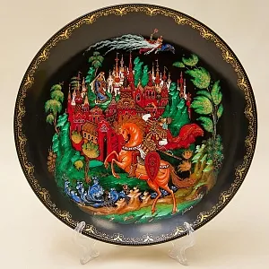 В этой серии декоративных тарелок тесно сплелись традиции фарфоровых дел мастеров России и одного из старейших народных промыслов - Палехской лаковой миниатюры сложившейся и развивающейся в поселке Палех, Ивановской области, Лаковая миниатюра выполняется темперой на папье-маше и покрывается несколькими слоями лака. Стиль палехской живописи имеет ряд отличительных особенностей, его ни с чем нельзя спутать - это и необыкновенная плавность линий, тонкость и точность рисунка, вычерченность силуэтов, темный фон, динамичное сочетание ярких цветов, традиционные сюжеты - все в изделиях Палехской лаковой миниатюры восходит к древнерусским традициям.
