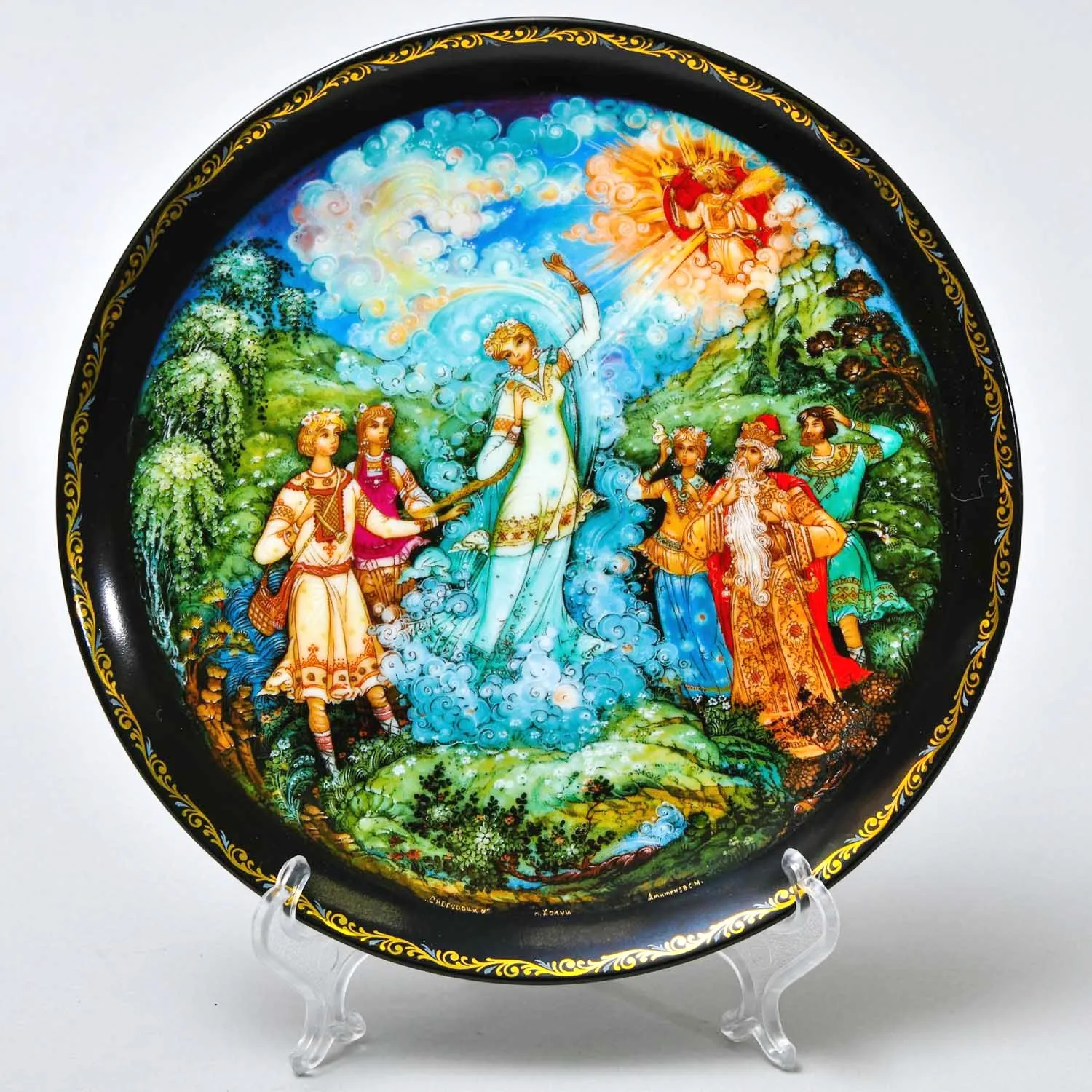 Оригинальная, Декоративная, Коллекционная, тарелка "ДВЕНАДЦАТЬ МЕСЯЦЕВ" - это первая тарелка из серии «Русские Сказки" единственный официальный выпуск работы Палехской художницы Елены Алимовой, Ленинградский Фарфоровый завод им. Ломоносова (ЛФЗ), тираж ограничен 195 днями обжига, 1988 год. Фарфор, Деколь, Позолота.Тарелка изготовлен с применением редких красок и натурального золота, на основе Палехского лакового оригинала специально изготовленного художницей для этой тарелки по мотивам поэмы А.С. Пушкина "Руслан и Людмила".