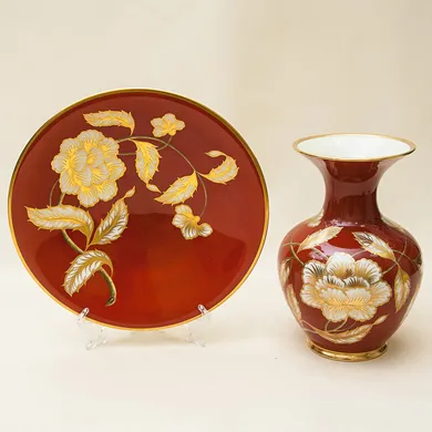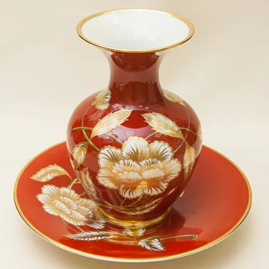 Декоративная, Роскошная, комфортного размера (высота 25 см.) фарфоровая Ваза из знаменитой коллекции «Золото Роз», Германия, Бавария, мануфактура Hertel, Jacob&Co. Атрибуция по клейму 1969-1979 годы. Потрясающее по красоте изображение золотой розы, на очень красивом и необычном фоне - кирпично красный, тончайшая ручная прорисовка мельчайших деталей композиции роскошной распустившейся золотой розой (натуральное 22 -х каратное золото). Это шикарная ваза смотрится невероятно эффектно и антуражно и станет украшением практически любого интерьера, всё сделано в лучших традициях немецкой школы фарфора.