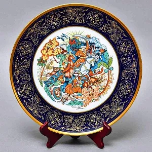 Оригинальная Декоративная Коллекционная тарелка "Решающая битва" из серии "Мифы, сказания" - 1980 год, тарелка изготовлена на мануфактуре Hutschenreuther (Хутчеройтер), Германия. Художник Fredericus Birke. Ограниченный тираж. Фарфор, деколь, позолота, натуральный кобальт. Всё сделано в лучших традициях высочайшего немецкого качества! Диаметр тарелки - 30 см.