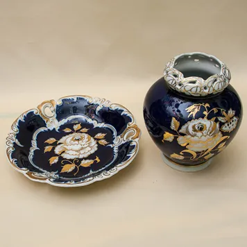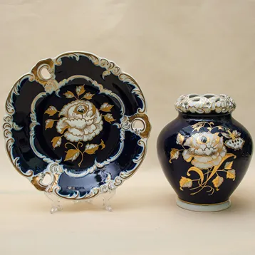 Невероятно Роскошное блюдо, тарелка из знаменитой коллекции «Золотая Роза», Германия - 1963 год, мануфактура ВАЛЕНДОРФ - WALLENDORF. Ручная работа, фарфор, натуральный кобальт, позолота (24-х каратное золото). На данный момент времени у нас в наличии имеются два предмета из этой чудесной коллекции, вместеони создают неповторимый интерьерный ансамбль.