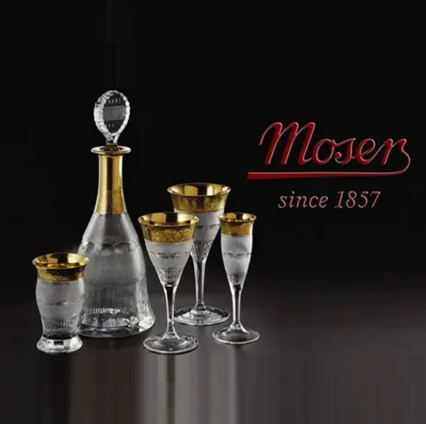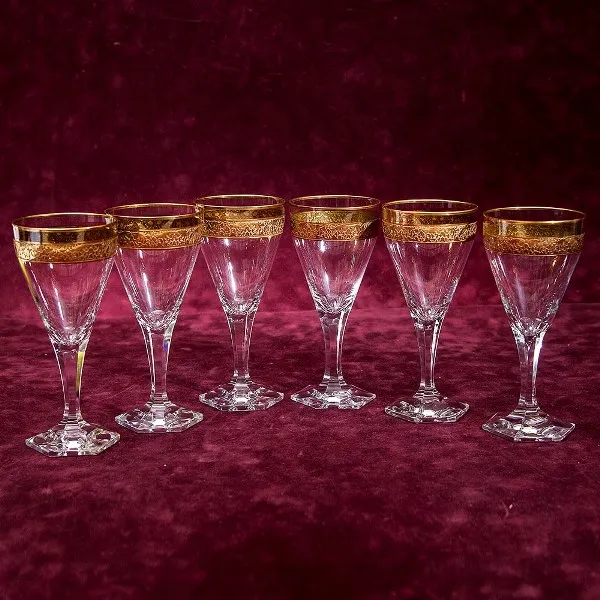 Роскошный и очень стильный, Набор из 6-и бокалов для вина, прозрачный хрусталь, Чехия, от всемирно признанного мирового ТОП - литера по производству изделий из стекла и хрусталя - MOSER (МОЗЕР), коллекция «Копенгаген» - «Copenhagen», вторая половина ХХ века. 100% ручная работа, высококачественный хрусталь, позолота (натуральное 22-х каратное золото). На дне каждого фужера есть сигнатура Moser.