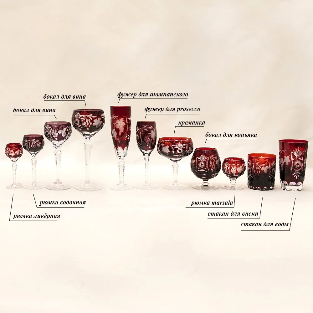 Роскошный и очень стильный, Набор Графин и шесть Рюмок «Marsala Glass - Виноград», цветной накладной хрусталь, 100% ручной работы. Производство немецкой мануфактуры с мировым именем - NACHTMANN, конец 60-х гг. прошлого века. Рисунок Traube - Виноград, один из самых красивых и трудоемких. Настоящий высококачественный свинцовый хрусталь с содержанием окиси свинца не менее 24% (PbO 24% - мировой стандарт), такое содержание окиси свинца увеличивает показатель преломления, что позволяет хрусталю играть всеми гранями на солнце подобно драгоценным камням. Представляют коллекционную ценность!!