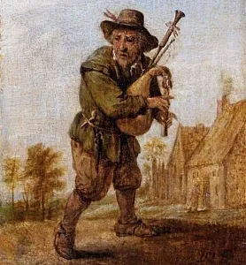 100% авторская ручная работа. Мастер с удивительной точностью передал каждую деталь: складки простой рубахи и широкого плаща, который свободно ложится на плечи; фактуру шляпы, словно вырезанной из того же дерева, что и вся фигура; даже мелкие черты лица — изящные брови, длинные ресницы и нежные губы — проработаны с любовью. Руки, обхватывающие волынку, кажутся живыми. Статуэтка стоит босиком на круглом основании, что подчеркивает бедность и простоту героя.