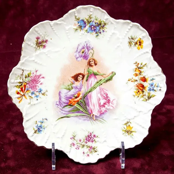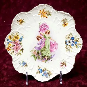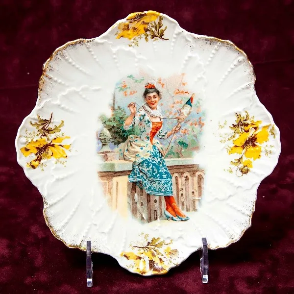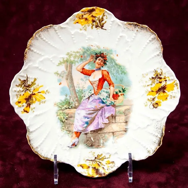Антикварная коллекционная тарелка - блюдо "Девушка с веретеном", Австрия, Britannia Porcelain Works Karlsbad, конец XIX - начало ХХ века. Белоснежный фарфор, рельеф, деколь, позолота. Диаметр тарелки - 21.5 см. Тарелка оригинальной формы, изящно декорирована, в центре блюда изображена молодая девушка в изящном платье по моде XIX века с веретеном и нитями в руках, по рельефному борту тарелки изображение различных цветов. Прекрасное коллекционное состояние для предмета столь почтенного возраста без сколов и трещин, есть минимальные потертости позолоты и деколя не влияющие на общий вид тарелки.