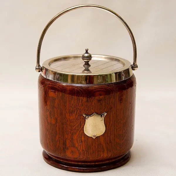 Оригинальная Стильная Бисквитница, Англия 30-е годы прошлого века. Натуральное дерево, крышка и ручка металл, внутренняя вкладка - фарфор. Многофункциональна, может использоваться как - Конфетница - Сахарница или просто Баночка с крышкой для любых сыпучих продуктов, объём - 900 мл. Размеры: максимальная высота с крышкой - 23 см., максимальный диаметр - 14 см., вес - 1,3 кг.