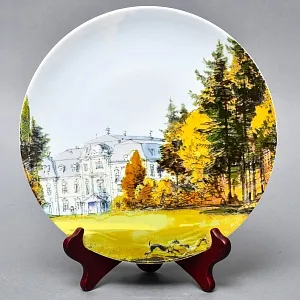 Позвольте себе окунуться в атмосферу спокойствия и изысканной грации эпохи ХIХ века! Эта редкая коллекционная тарелка — не просто украшение, а миниатюрный шедевр, воссоздающий великолепие Дворцового парка в Дюссельдорфе. Изображение выполнено по цветной литографии Иоганна Петерсена (произведение находится в собрании городского музея Дюссельдорфа). Изящные линии архитектуры и живописные мазки акварели создают неповторимое ощущение легкости и утонченности. На ней вы увидите изящный мост, перекинутый через лазурный пруд, отражающий нежное небо. Вдоль извилистых дорожек прогуливаются пары в элегантных нарядах, словно сошедшие со страниц старинного альбома. Густые зеленые насаждения, стройные деревья и пышные кустарники создают ощущение уединенного уголка, где время остановилось. Каждая деталь — от узорчатого парапета моста до легкой игры света на воде — передана с удивительной точностью и художественной чувствительностью, превращая тарелку в настоящее художественное произведение. Это не просто декоративная тарелка для украшение стен— это кусочек истории и искусства.