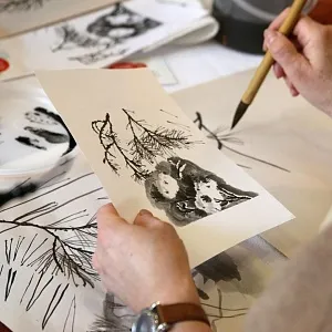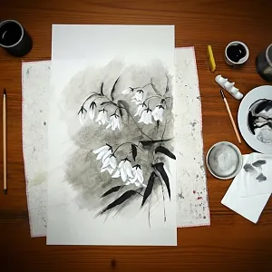 На полотне — мощь природы, застывшей в моменте вечности. Скалы, словно выкованные небесным молотом, возвышаются над водной гладью, их грани прорезаны тенью и светом. Изогнутая сосна, корнями вцепившаяся в камень, — символ стойкости и изящества. Вдали, сквозь туман, мерцает арочный мост — мост между мирами, между реальностью и мечтой. Художник не просто рисует горы — он передаёт их дыхание, силу и тайну. Тушь, размываясь, создаёт эффект воздушной перспективы, акварель — нежный отсвет рассвета, застывшего на вершинах.