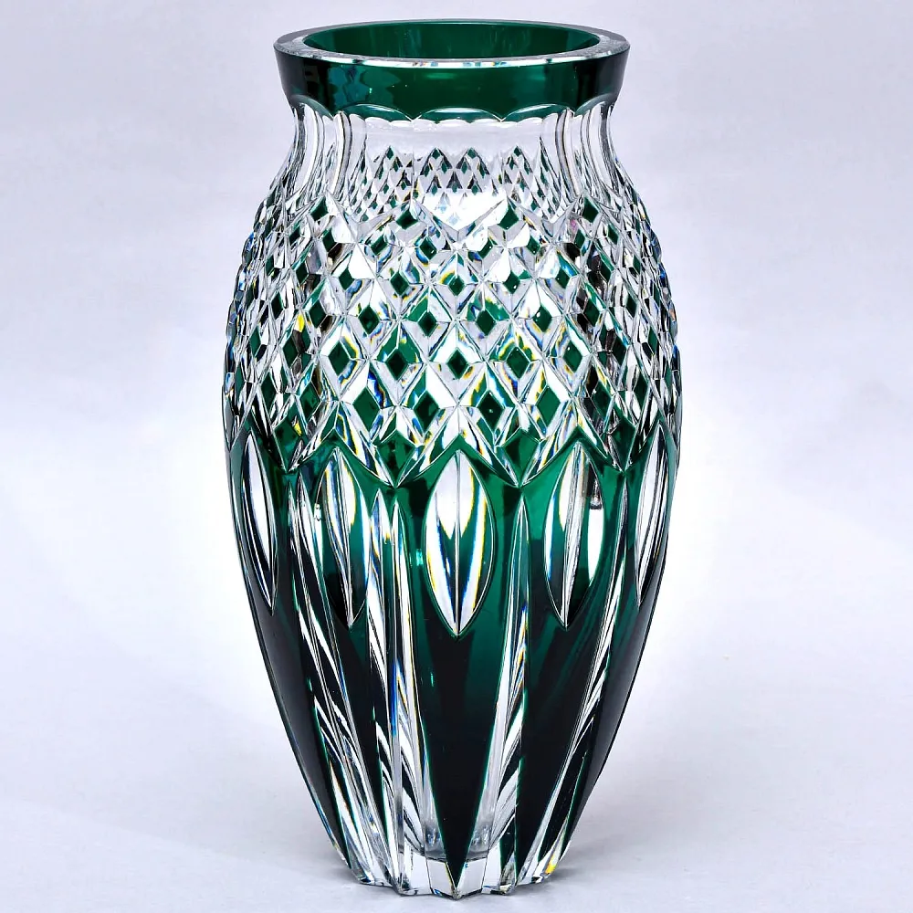 Представленная Вашему вниманию роскошная Ваза из цветного хрусталя, изящна и брутальна одновременно. Эксклюзивный дизайн, ручная работа, настоящий высококачественный свинцовый хрусталь с содержанием окиси свинца не менее 24% (PbO 24% - мировой стандарт), такое содержание окиси свинца увеличивает показатель преломления, что позволяет хрусталю играть всеми гранями на солнце подобно драгоценным камням. Ваза великолепно смотрится, очень удобна для цветов, устойчива за счет своего веса, также может использоваться, как самостоятельный предмет декора.